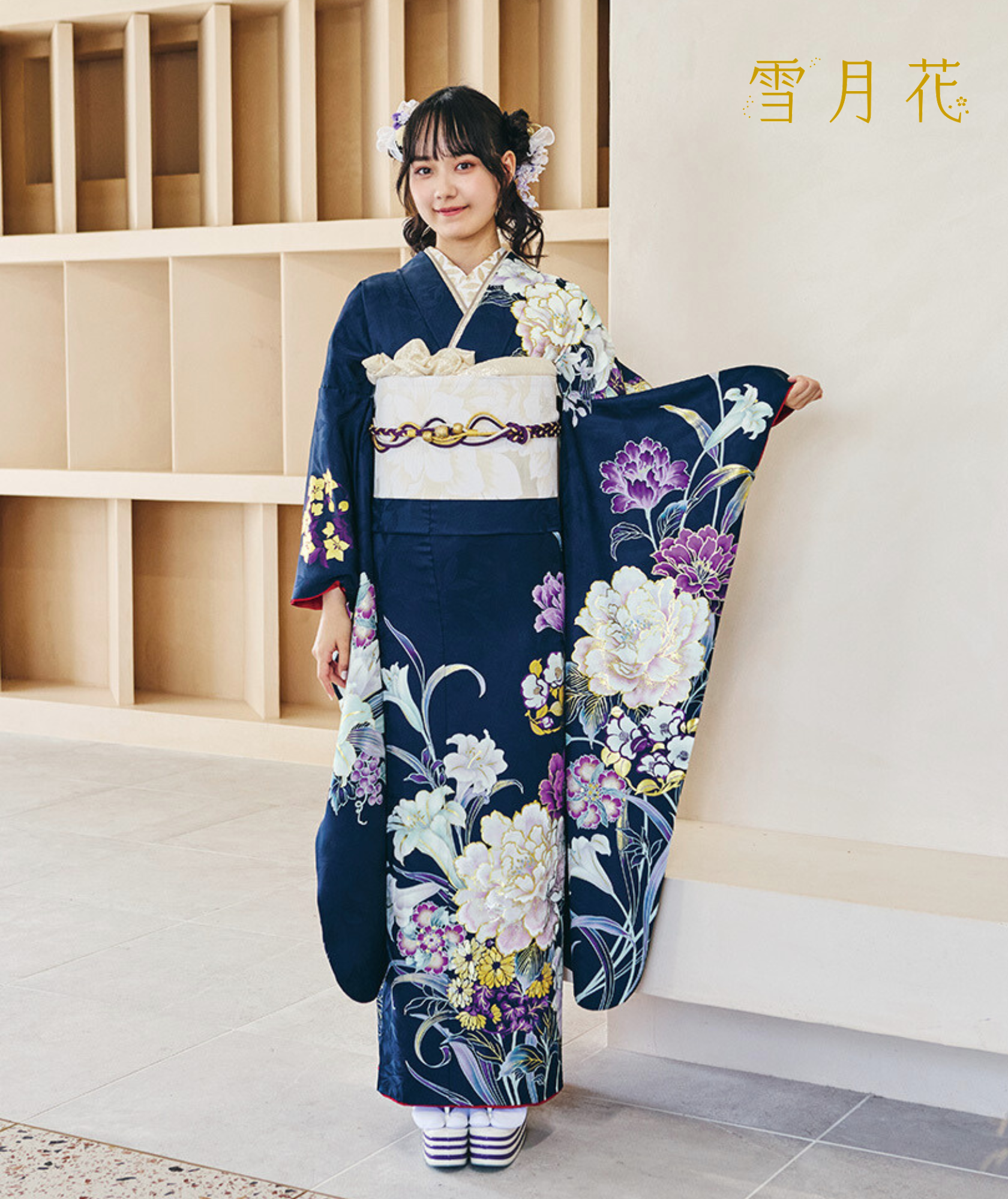 振袖の柄に、ブルベさんの得意な「白」や「黒」が大胆に使われているものを選ぶと、顔まわりに透明感が出て、全体的に引き締まった印象になります。