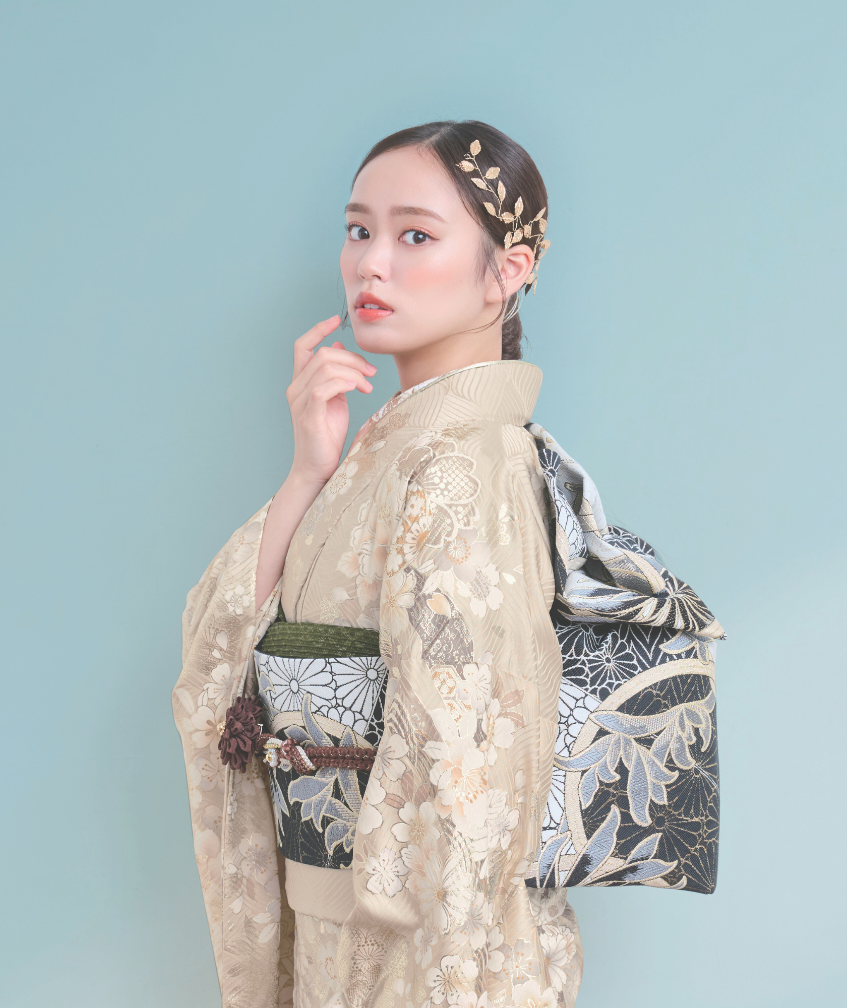 光の当たり方で色が変化するミステリアスな輝きが、寒色系振袖の知的な雰囲気と相まって、儚げな美しさを演出してくれます。